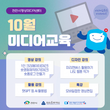 천안시영상미디어센터 비채 충남 천안시 동남구 중앙로 111 대표번호: 041-415-0099